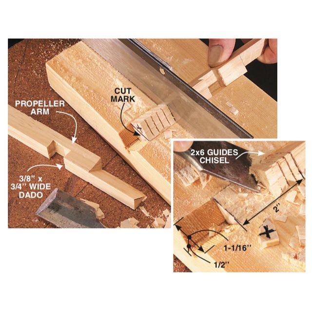 Cutting the propeller arms (D) is the trickiest woodworking of the project. Use a fine-toothed saw to make kerfs for the dadoes where the arms cross and for the four angled faces where the propellers are attached (Photos 1 and 2), then carefully use a chisel to remove the waste.
