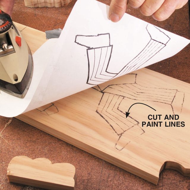 3. Use carbon paper or a photocopy and iron to transfer the pattern to wood. Cut out pieces with a jigsaw. Cut parts for large flag and glue on cloth flags with exterior glue—spread it over entire surface and smooth flag on.