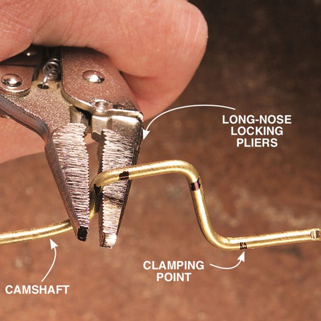 Bend the camshaft (using the pattern in Fig. B) by holding the brass rod tightly with a locking pliers about 1/8 inch back from where you want the bend, and then make the bends. Flatten any warps in the camshaft after all the bends are made.