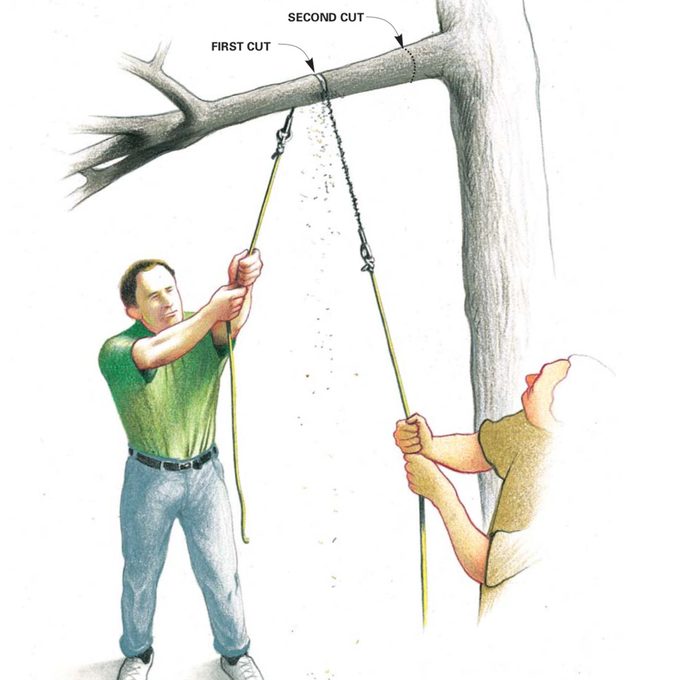 Need to remove a branch that’s just out of reach of your pole trimmer or shears? Tie a rope to each end of a camping saw (available at most outdoors stores) and throw one rope over the limb. Alternately pull each end of the rope until you cut through the limb. Make two cuts as shown, and keep well away from electrical lines.