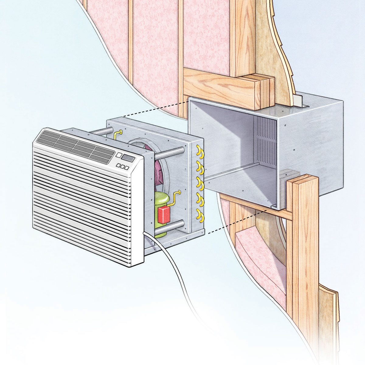 An in-wall air conditioner means no more wrestling with a window unit every spring and fall. It’s basically the same as a window unit. You frame the opening just like framing a window. The primary differences: It vents on the back instead of along the sides, and it sits flush or extends only slightly farther out from the exterior wall.
