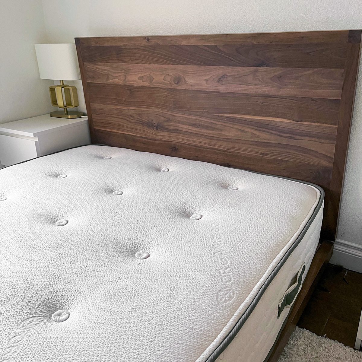 Our California king mattress is the new focal point of our baster bedroom—without overpowering it.