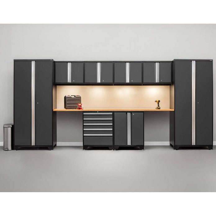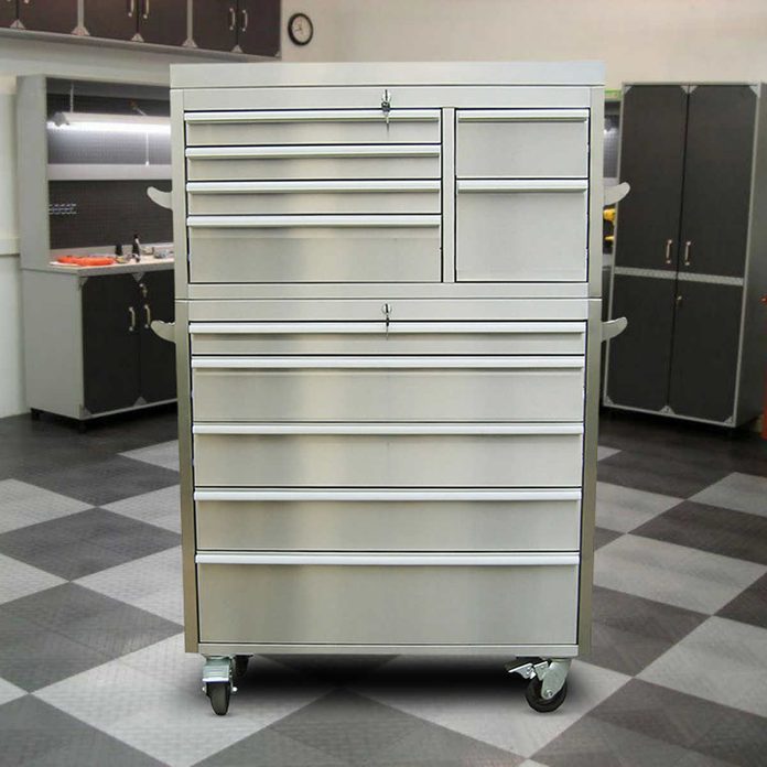 Now if you have a lot of tools, this may be the storage unit you’ve always been dreaming of. It’s made with 18-gauge heavy-duty steel with bright white frames and platinum gray doors. It has larger storage for those power tools and other DIY necessities, but also a smaller drawer cabinet for those tiny hand tools that you don’t want to misplace. P.S. We love these customizable NewAge garage cabinets, too.