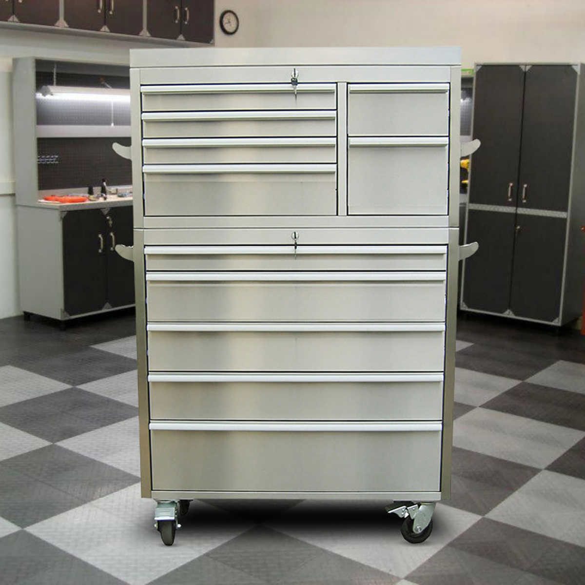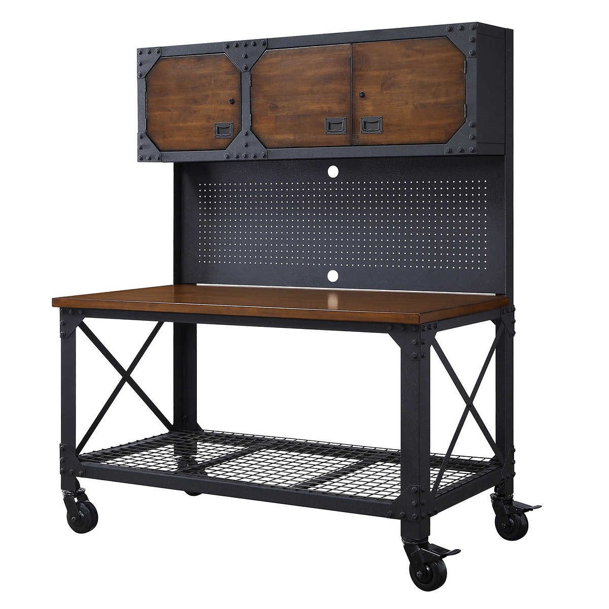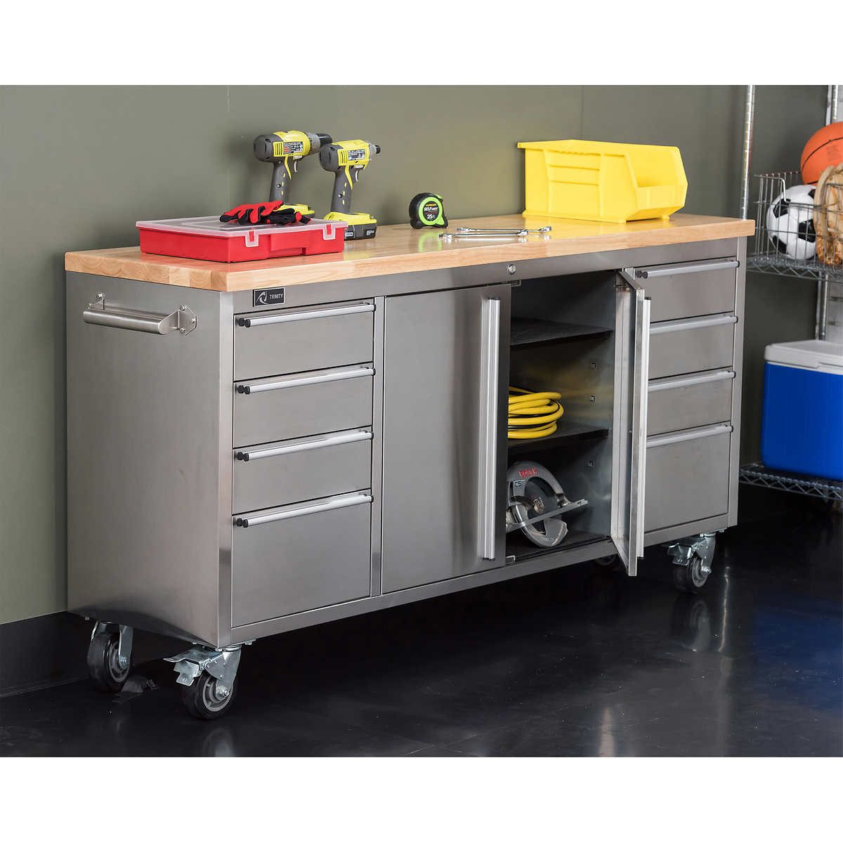 Looking for something classier compared to the light stainless steel storage? This wooden workbench with dark stainless steel will give your garage a classy feel. Although the cabinets won’t have as much storage as some of these other units, it does come with a workspace and large storage for power tools underneath.