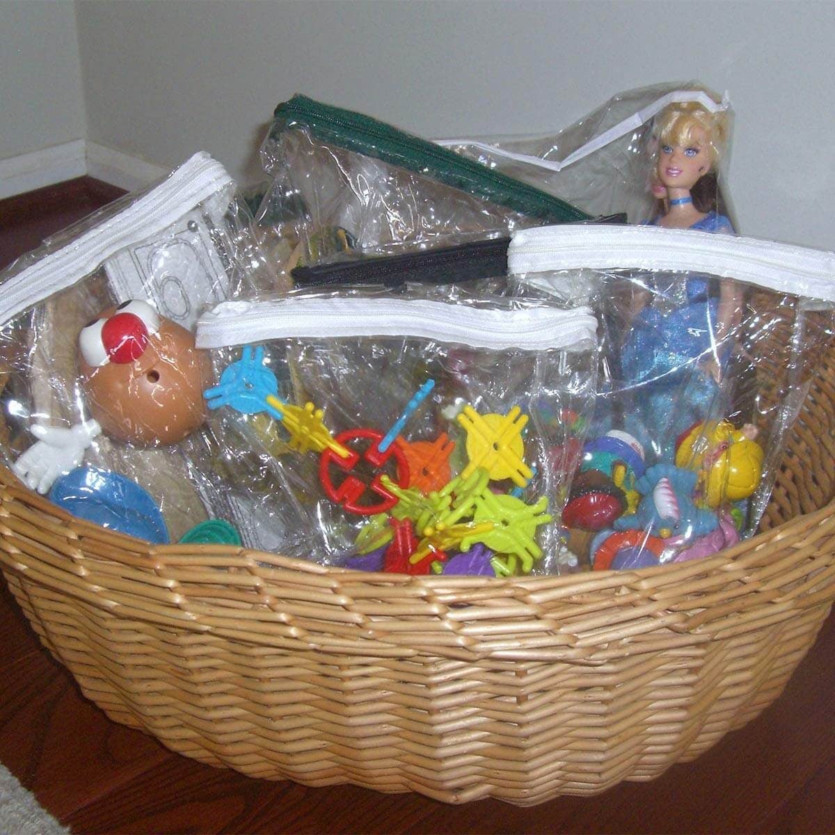 If you purchase new bedding or curtains, they’ll likely come in a plastic bag with a zipper. Use those bags to store your child’s small toys or even your jewelry or toiletries when vacationing. Find more ideas here.