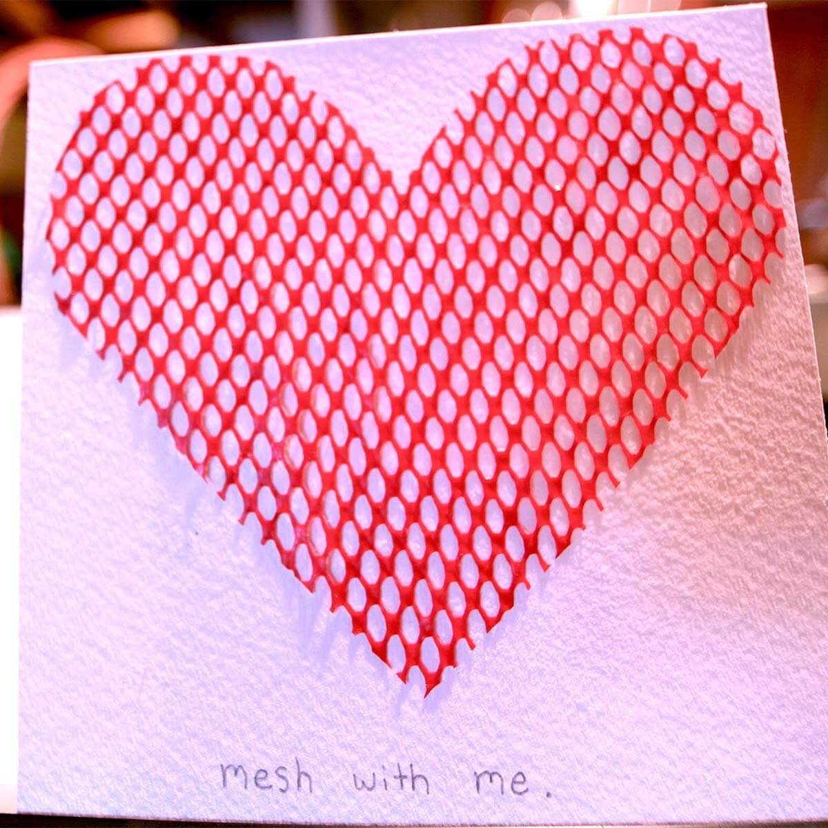This Valentine is made from a plastic mesh produce bag that is cut in the shape of a heart and attached to a piece of paper. Take this idea from Trash Backwards and make your own Valentines and greeting cards.