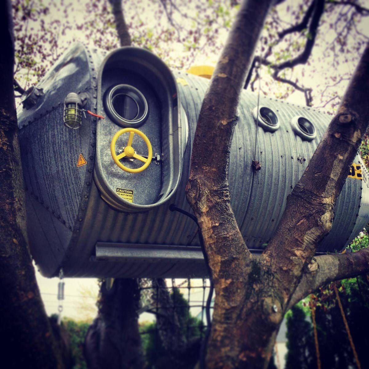 Talk about getting creative when it comes to working with recycled material. Jonathan Juhasz took an old grain silo he found on Craigslist to begin building this treehouse. He added in a repurposed galvanized steel water trough for the doorway and included fiberglass bench seating that he repurposed from a bowling alley. One of the cooler features is a slide, a perfect escape hatch for an emergency landing.
