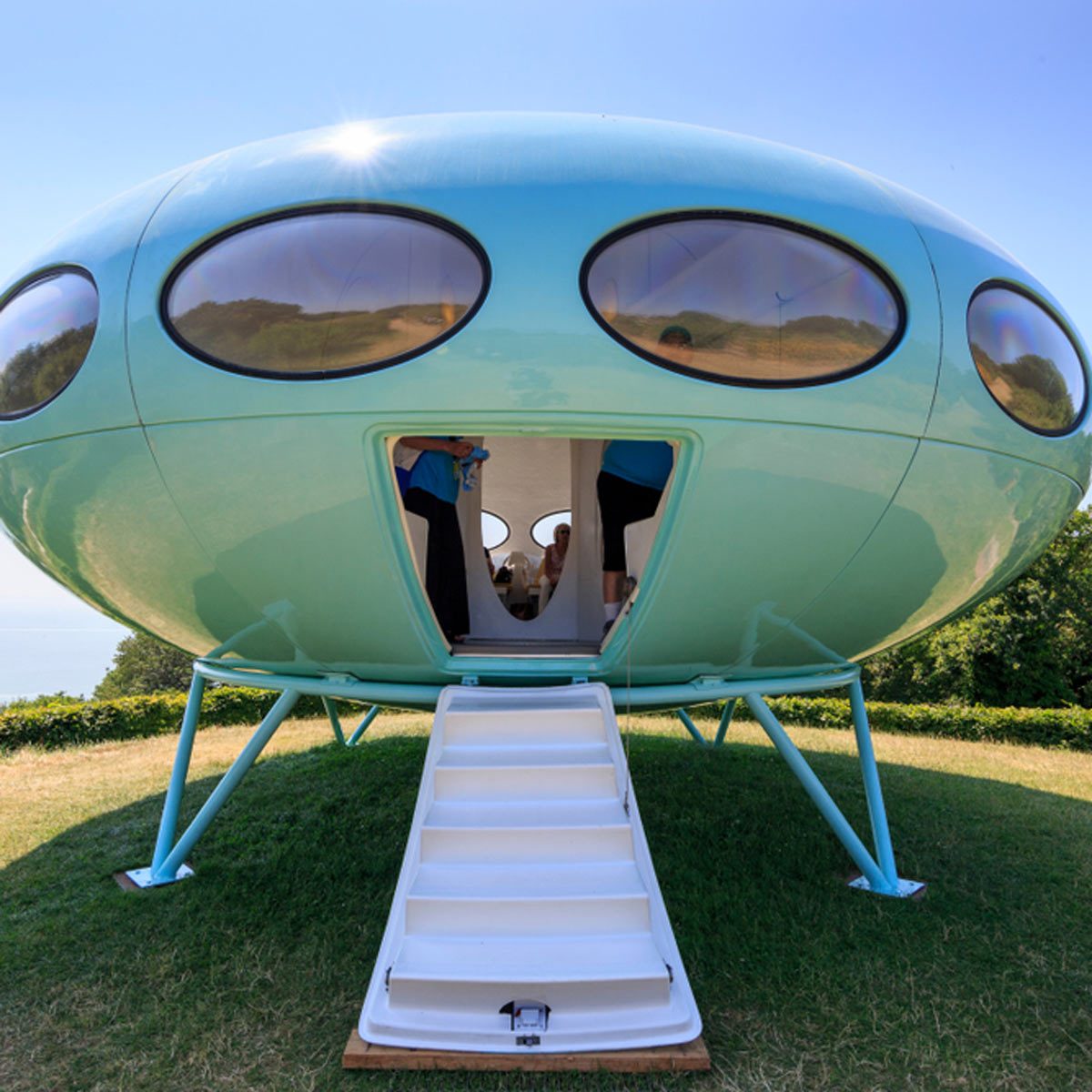 The Futuros, as seen in this photo, have airplane doors that fold down. This is the first Futuro manufactured after the prototype and is on display in Espoo, Finland at the WeeGee Exhibition Center as part of the 50th birthday of the Futuro.