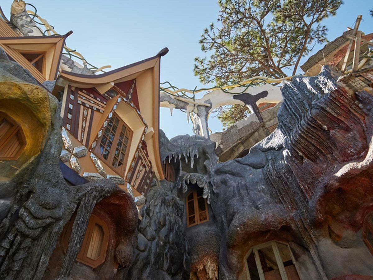 Đặng Việt Nga designed and constructed the Hằng Nga guesthouse in Vietnam, which has attracted attention since its opening in 1990. From the outside it looks like a giant tree but it gets pretty surreal after that. It gets described as a fairy tale house and it uses few right angles. It boasts 10 themed guest rooms like a kangaroo room and an eagle room.