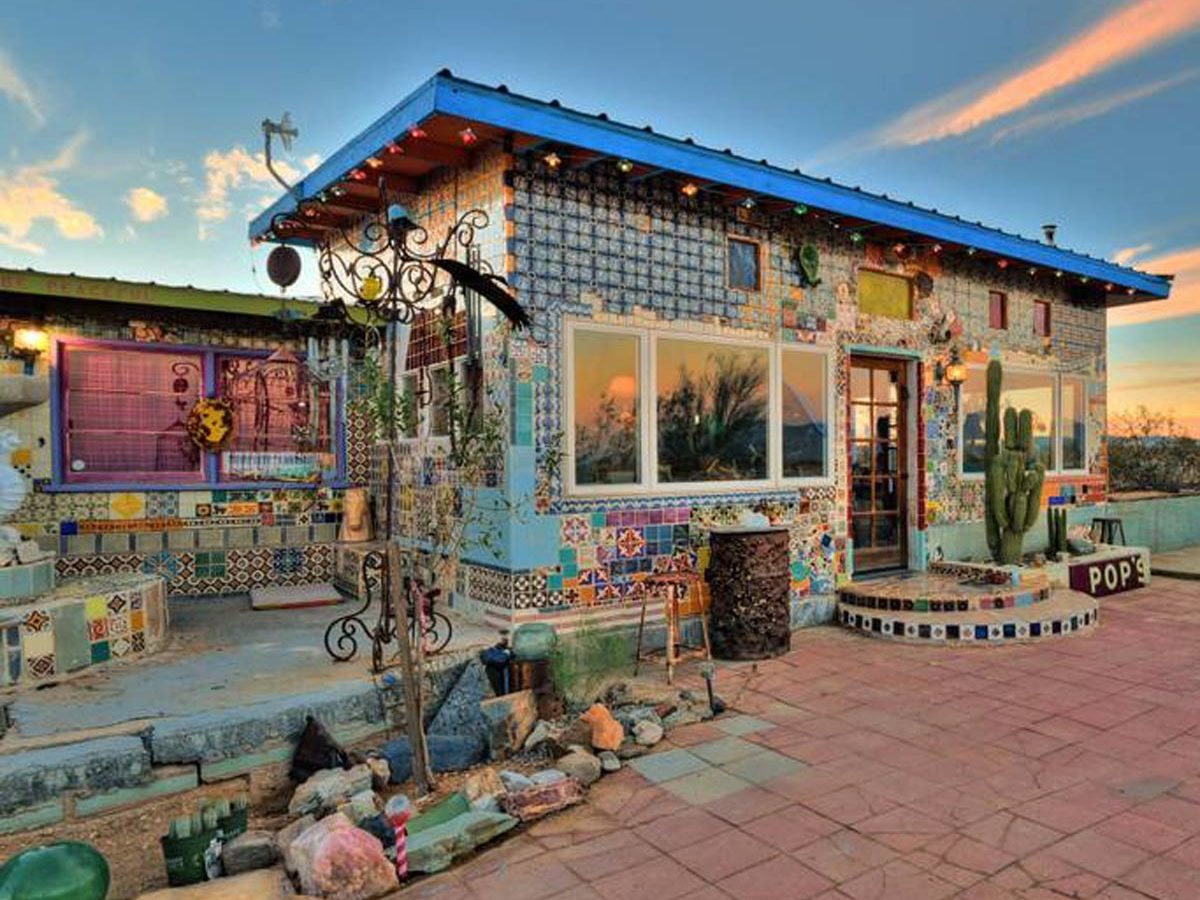 Outside of Joshua Tree in California, travelers can revel in the visually stunning tile house that will have them inspecting the tiniest of details. The tile house is a mix of Mexican tile, smalti, handmade Perry Hoffman ceramics, tile and fused glass, found objects and stained glass.