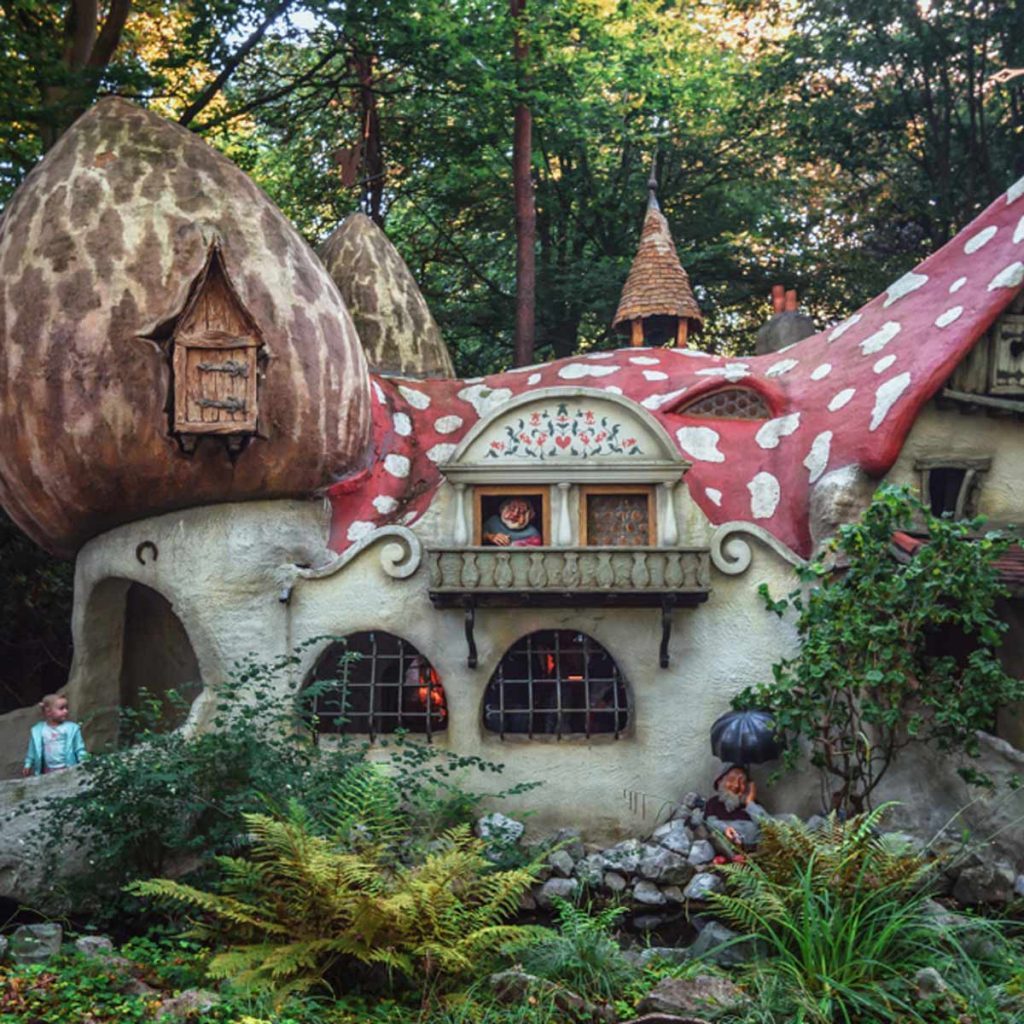 The gnome village with the mushroom houses in the fairytale forest in the theme park Efteling in the Netherlands. The Fairytale Forest opened in 1952 with 10 fairytales in it and it has expanded through the years.