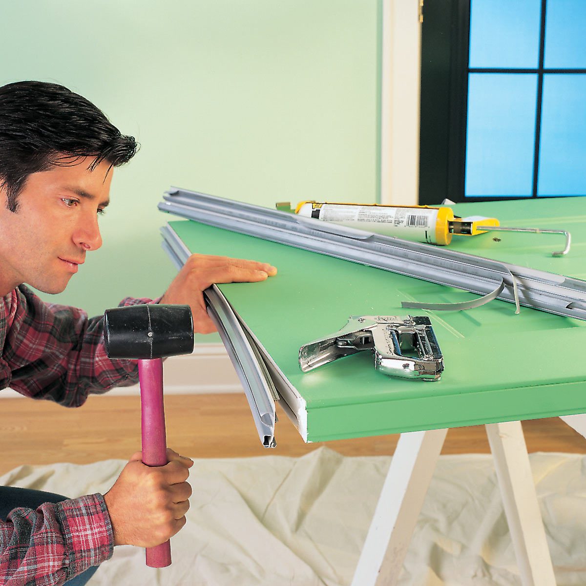 Close the door and pop out the hinge pins with a pin punch to remove the door. Set the door on a work surface and remove the old door sweep. Caulk the ends of the door, then install the replacement sweep. Some sweeps are tapped into place and stapled along the door bottom; others are screwed to the side along the door bottom. If a drafty sliding patio door is your problem, here’s how to fix it.