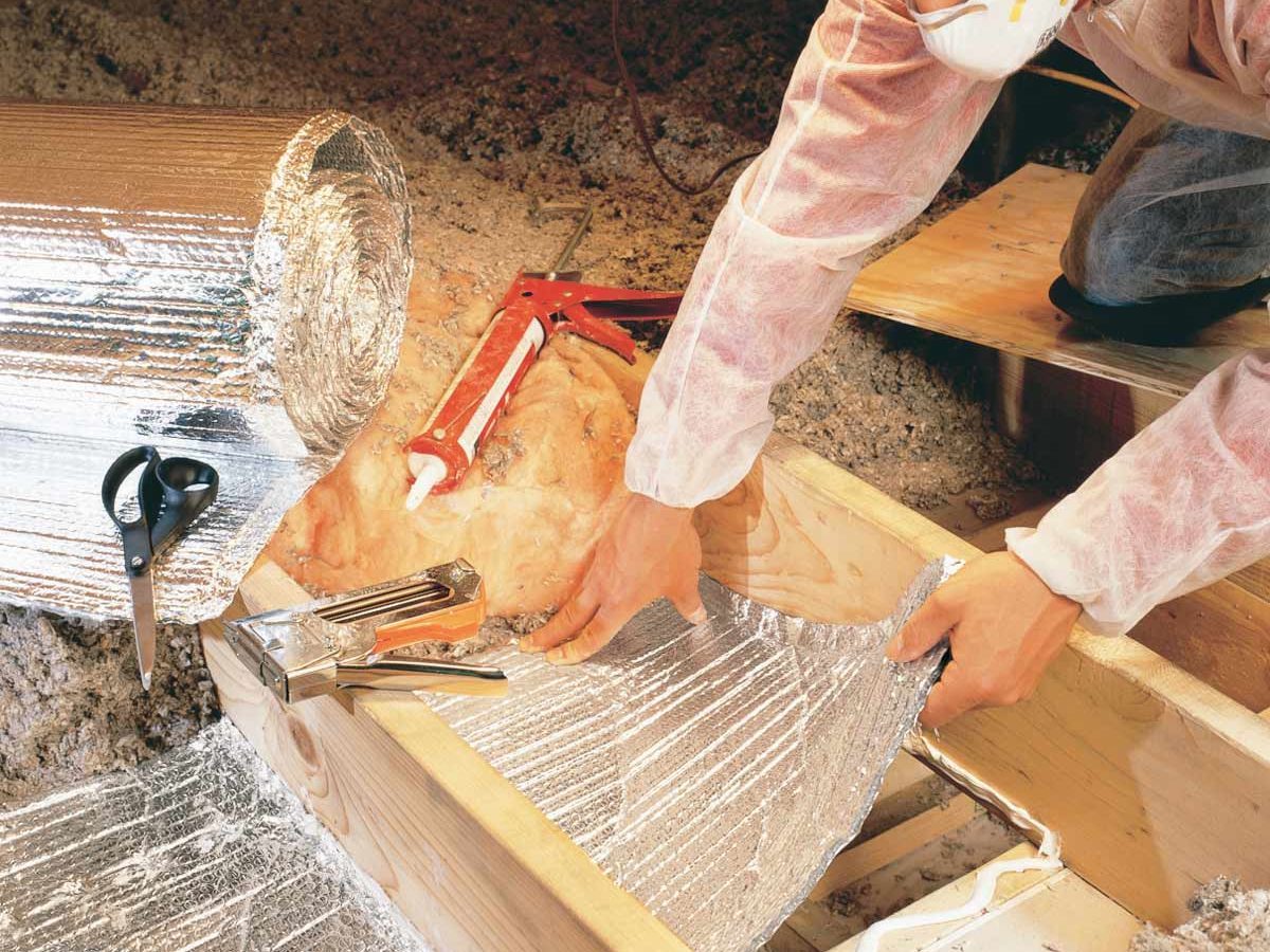 Builders often put a soffit where they want to put cabinets or recessed light fixtures, and sometimes they use soffits to contain heating ducts. Soffits have a high potential for leakage, especially if they contain recessed lights. Refer to your sketch and dig around in the insulation if necessary to find them. Reflective foil insulation, sometimes called “bubble-pack” insulation, works well as an air barrier for soffits. It’s flexible and only about 1/4 in. thick, making it easy to cut with a scissors. You have to clear insulation from the surrounding wood to get the caulk to stick. Then cover the foil with insulation when you’re finished. However, don’t put insulation within 3 in. of recessed lights unless the fixture is IC rated (for “insulation contact”). The rating will be listed on a label inside the recessed can.