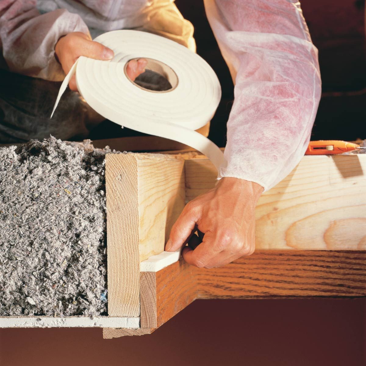 After sealing the attic bypasses, push the insulation back into place with an old broom handle or a stick as you back out of the attic. Then finish up by sealing the access hatch with self-sticking foam weatherstrip. You may have to add new wood stops to provide a better surface for the weatherstrip and enough room for hook-and-eye fasteners. Position the screw eyes so that you slightly compress the weatherstrip when you latch the hatch. Use a similar procedure if you have a hinged door that leads to the attic.
