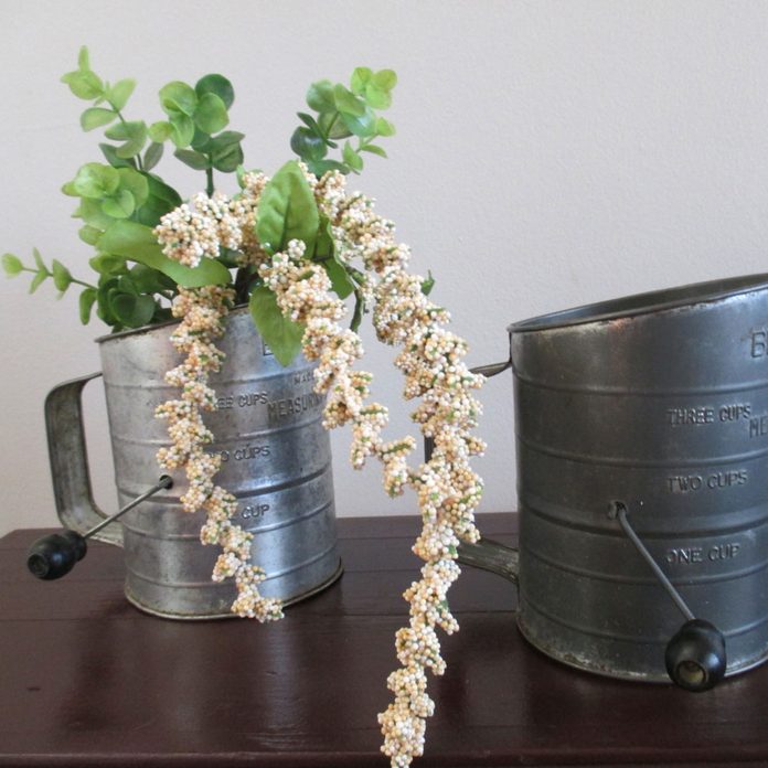 If you have an old flour sifter you no longer use, try turning into a planter. If you don’t have one, there’s a good chance you’ll find one at a thrift store or garage sale to use for repurposing ideas.