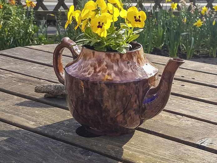 This old tea pot has a new life as a planter. You can get a similar look with an old coffee carafe.