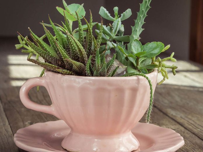 Try using an old coffee mug or tea cup to grow some small plants. Try an oversized mug to hold flowers on your dining table.