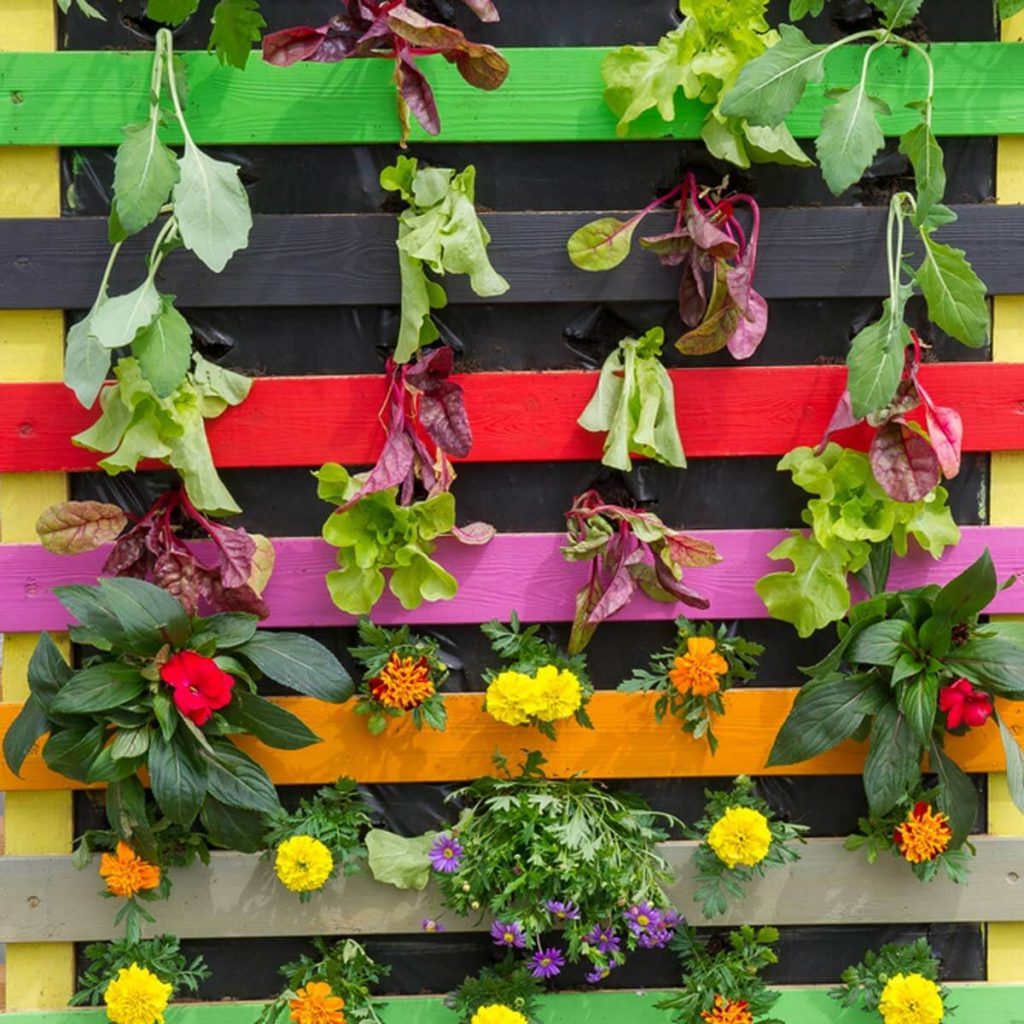Here’s yet another project that uses an old wooden pallet. You’ll need some landscape fabric to attach to the back side of the pallet, then fill with soil and plant your flowers. Prop the planted pallet up against a wall or fence.