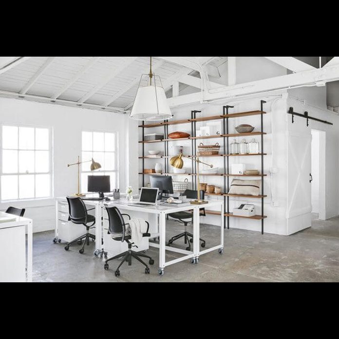 This former chicken coop was turned into a light, bright, streamlined, and serviceable office extension for Goop HQ! Designer Melanie Burstin festooned wall-mounted bookcases with offerings from the respective departments (in this case, gorgeous home goods) to distinguish each team’s area.