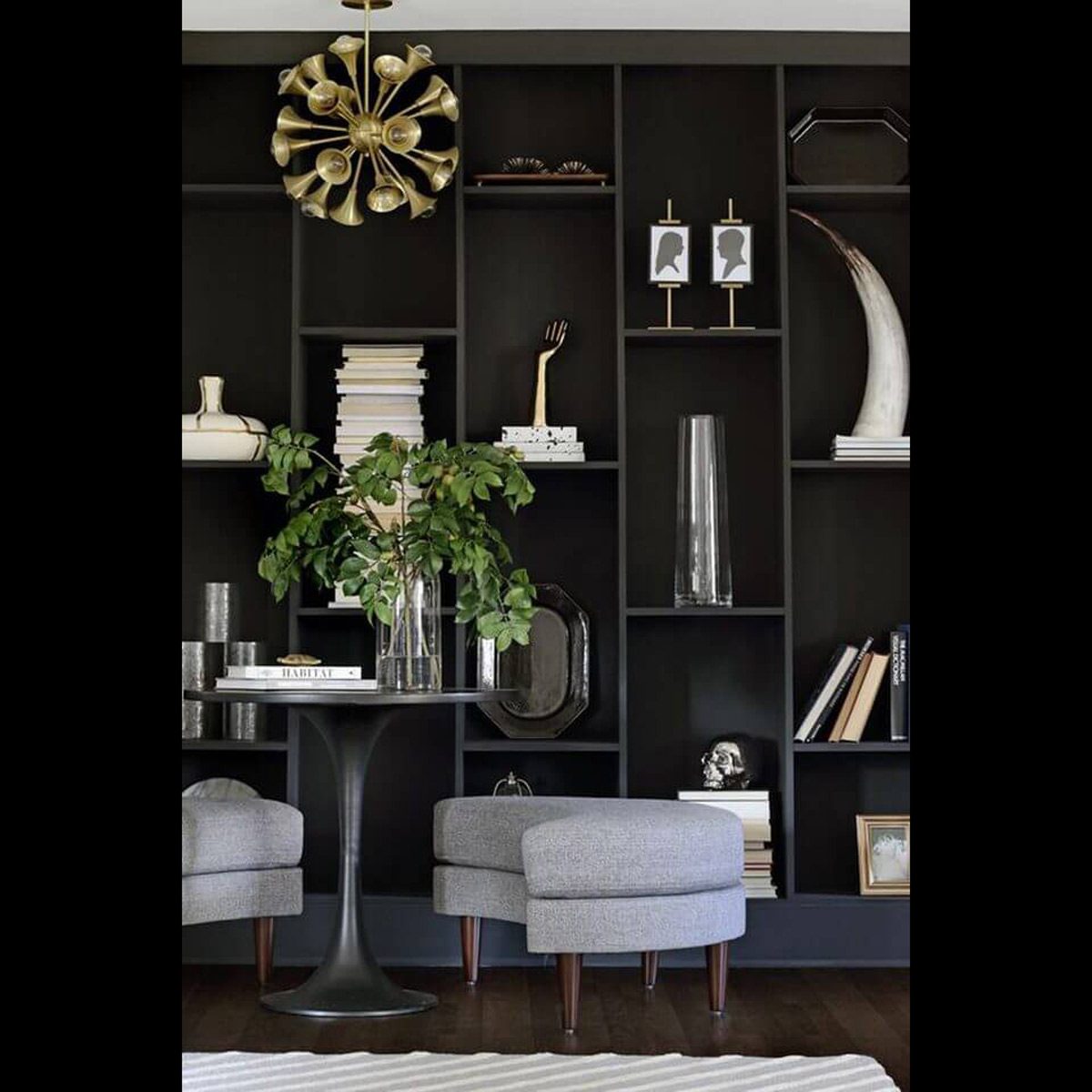 Take advantage of every square inch. Kristin Jackson of The Hunted Interior took it upon herself to make this black beauty. The built-in, floor-to-ceiling design displays a carefully curated selection of books and decorative objects.