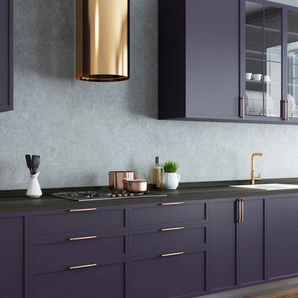 Green is another dark cabinet color Scheck’s seeing a lot of lately, and she really loves the “deep, earthy green” of Studio Clay by Sherwin Williams. Emerald tones are popular in new and remodeled kitchens everywhere, which provides a beautiful opportunity to get the bright copper or gold kitchen cabinet hardware you’ve always wanted.