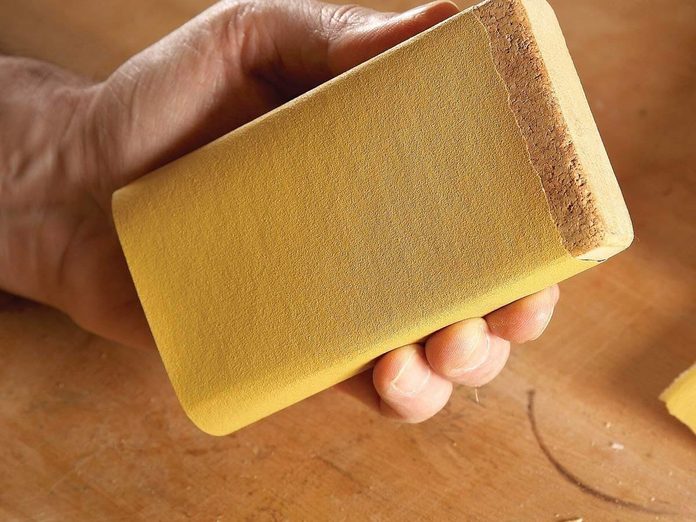 Best power sander in your shop? A quarter sheet of sandpaper and your bare hand! To improve the longevity of this natural marvel, apply spray adhesive to the quarter sheets, then fold them over to make a double-thick one-eighth sheet. They work great for sanding sculpted and molded edges, and the double-ply thickness lets you press hard without tearing a hole in the paper.
