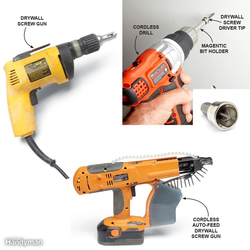 Here are your choices. If you only have a few sheets of drywall to hang, you can buy a special tip for your cordless drill that limits the depth you can drive the screw. These drywall screw tips cost just a few dollars and work well if you’re careful. A better option is a driver drill that’s built to drive drywall screws. You can buy a time-saving auto-feed version (center photo) that uses special collated screws, or a dedicated drywall screw gun (left) that drives regular drywall screws. Both versions have adjustable nosepieces for precise depth control. If you only need the tool for one drywall job, consider renting one for a day or two.