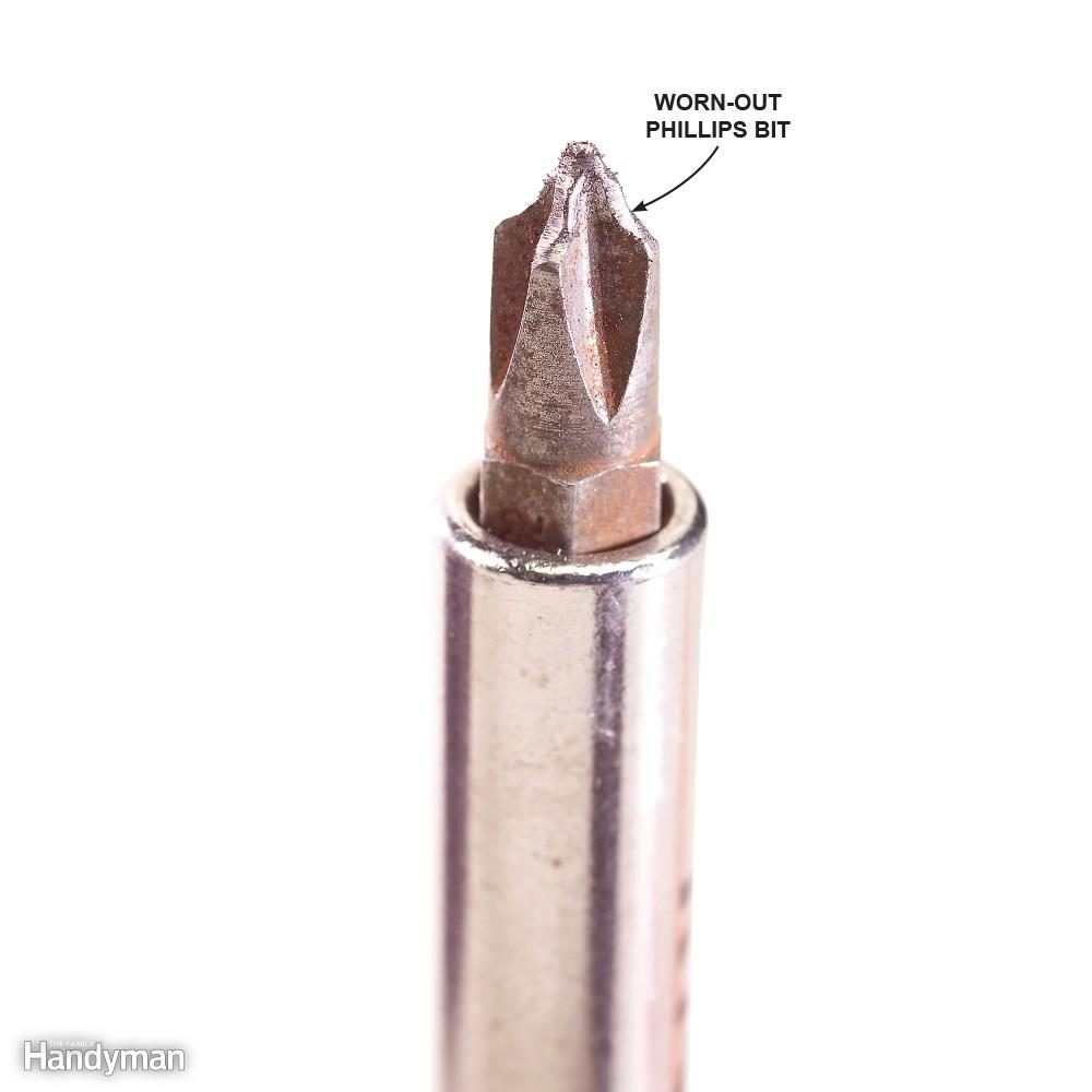 Using worn driver bits is a common mistake. This worn bit should have been replaced with a new one before it got this bad. If you’re using the right technique and the bit is still skipping in the screw head, it’s time to replace the bit. The trick is to have spare bits on hand so you can replace them at the first sign of wear. The next time you’re at the home center, buy a 10-pack of No. 2 Phillips bits and you’ll always have spares. Don’t forget to get a few of the other sizes and shapes too.