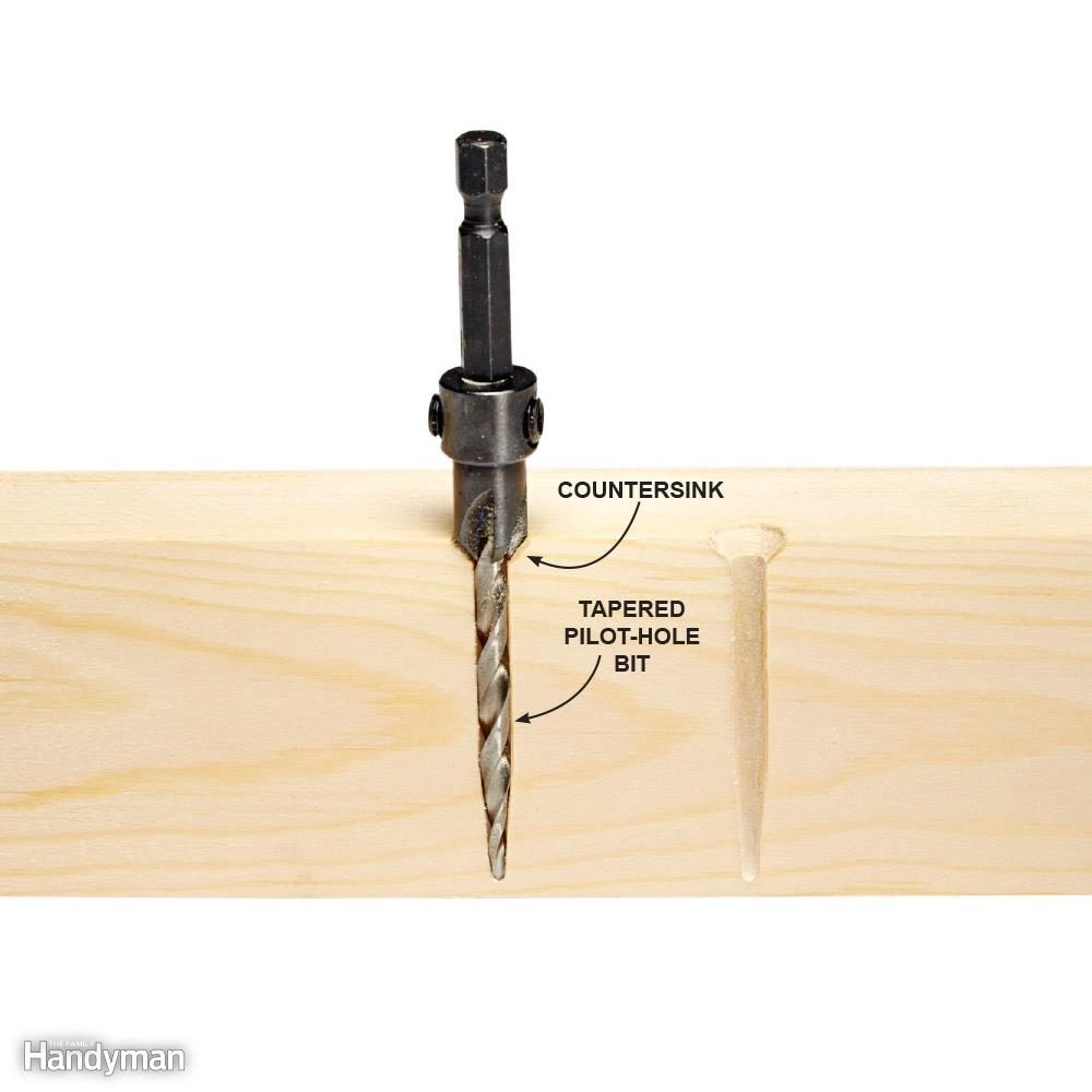 Drilling a pilot hole for the screw and then creating a recess, or countersink, for the screw head is standard practice on cabinets and furniture projects. The pilot hole bit creates a hole that reduces friction to make screw driving easier, and the countersink allows you to set the screw head flush with or below the surface. For straight-shank screws, the less expensive straight-bit design works fine. For tapered-shank wood screws, use a countersink fitted with a tapered-shank bit.