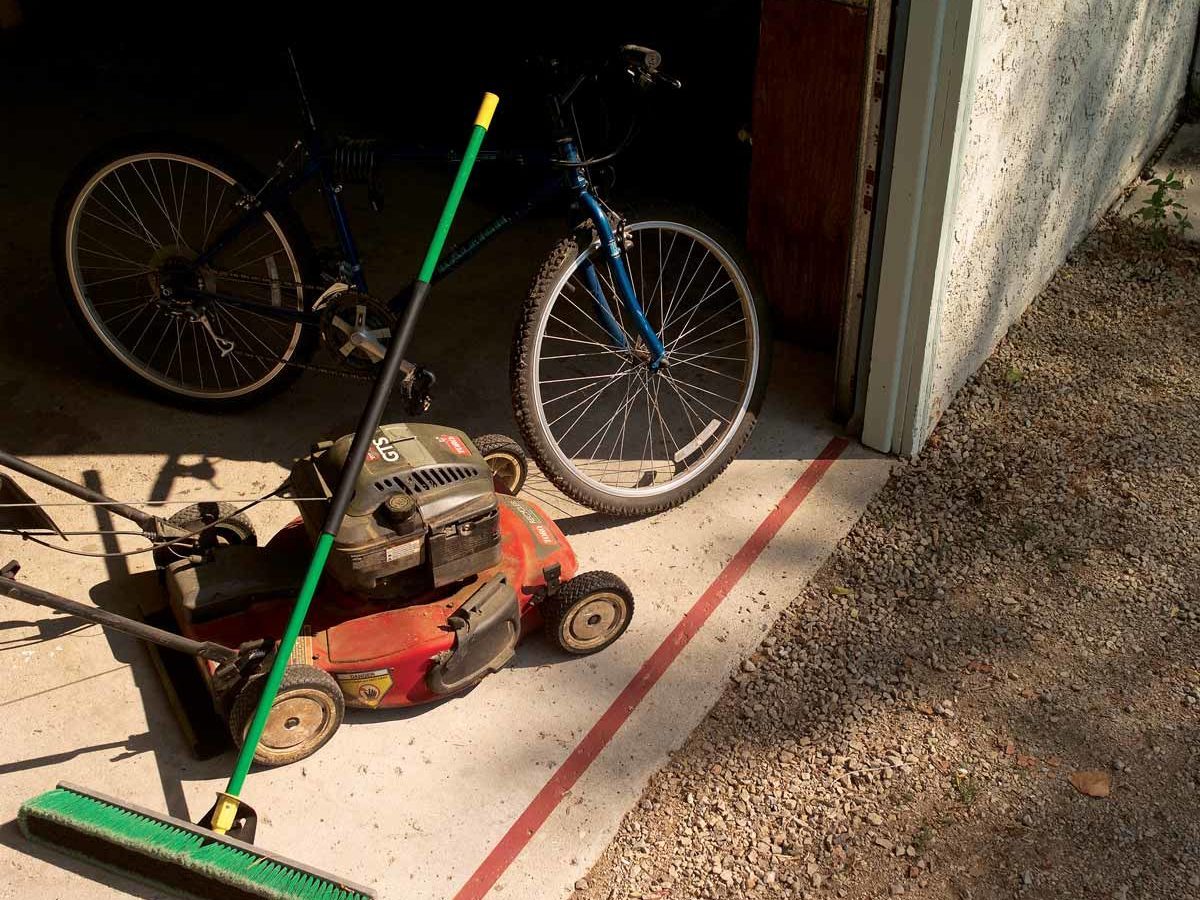 Here’s the straight solution for keeping bikes, trikes, garden tools and car bumpers from being squashed by a descending garage door (or keep them from triggering the electric eye). Close the garage door and press down a strip of 2-in.-wide masking tape along the inside edge. Lay another strip of tape 1-1/2 in. to the outside of the first. Spray on the line, pull the tape and let dry. Now when you close the door, glance at the line to be sure the door will seal on concrete, not on a tool or the tail of your sleeping cat.