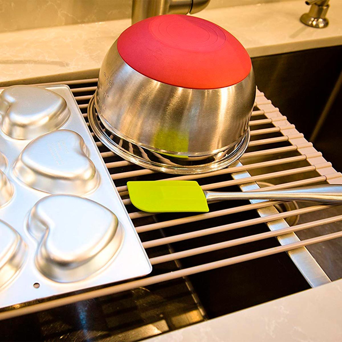 If you want a stylish over the sink dish drying rack, Shanik offers a great option. This expandable stainless steel over-the-sink dish drainer offers sufficient storage space for your dishes and cutlery. It will fit over most sinks too, since it can reach from 14 inches to 20.4 inches. It also works on counters. Need more storage? Check out these quick and clever kitchen storage ideas.