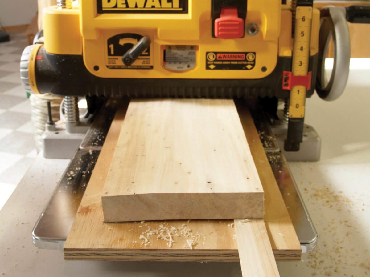 A jointer is the best tool for flattening twisted, warped boards. But what if you don’t have a jointer or the board is too wide? Set the board on a “sled,” a flat piece of 3/4-inch plywood. Then shim the high corner(s) so the board doesn’t rock. Also shim high spots in the middle of the board. Mark the shim locations, remove the board and hot glue the shims into place. Then glue the board to the shims and the plywood with a dab of hot glue. Send that rascal through until it’s flat, then pull it free and plane down the other side.