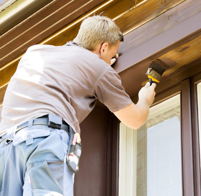 Painting exterior trim involves a lot of time-consuming prep work and brush work, so choose a premium paint for the longest-lasting protection—gloss or semigloss 100 percent acrylic latex. They’re more durable than flat latex because they have a higher resin content. The additional resin also delivers that glossy sheen, but because the trim covers a relatively small area, the shine isn’t prominent.