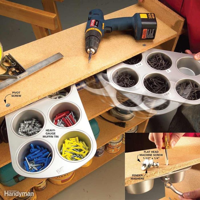 Attach a muffin tin under a shelf with a single 1/4-in. x 1-1/2-in. flat head machine screw. The tin pivots out from beneath work surfaces to organize and serve up any little doodad you frequently use. And you store all that little stuff without using up a single square inch of workspace. For best results when installing your muffin bins: