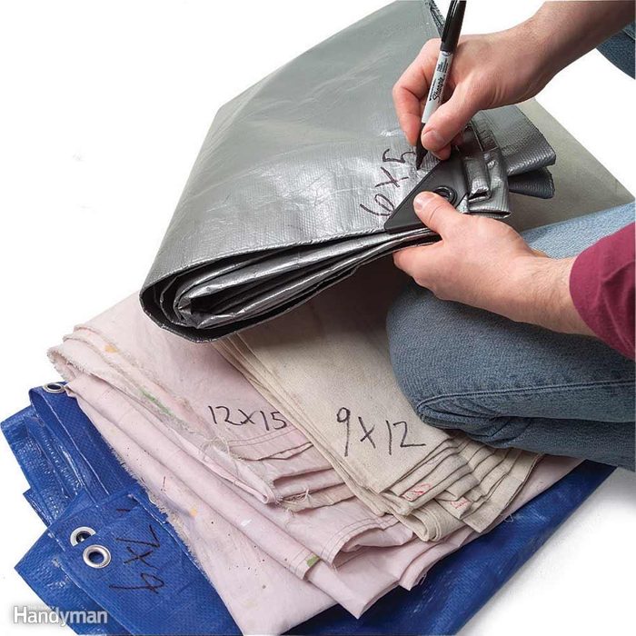 When unpacking a new tarp, write its size in all four corners with a permanent marker. When you sort through your tarps, it’s easy to find the right size without unfolding them all. Having the tarps labeled makes it easier to stow them away in a drawer or a cabinet too, saving a little more space. It works great for drop cloths too.