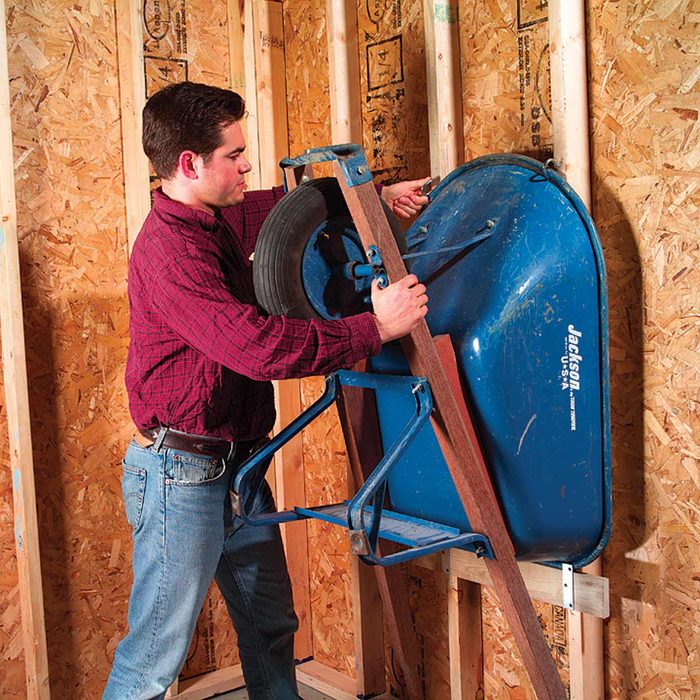 Hang your wheelbarrow on the garage wall to free up floor space. Center a 2-ft. 1×4 across two studs, 2 ft. above the floor. Tack it into place, then drive 3-in. screws through metal mending plates and the 1×4, into the studs. Leave about 3/4 in. of the plate sticking above the 1×4 to catch the rim. Rest the wheelbarrow on the 1×4 as shown, and mark the studs 1 in. above the wheelbarrow bucket. Drill pilot holes and screw ceiling hooks into the studs. Twist the hooks so they catch on the wheelbarrow lip and hold it in place.