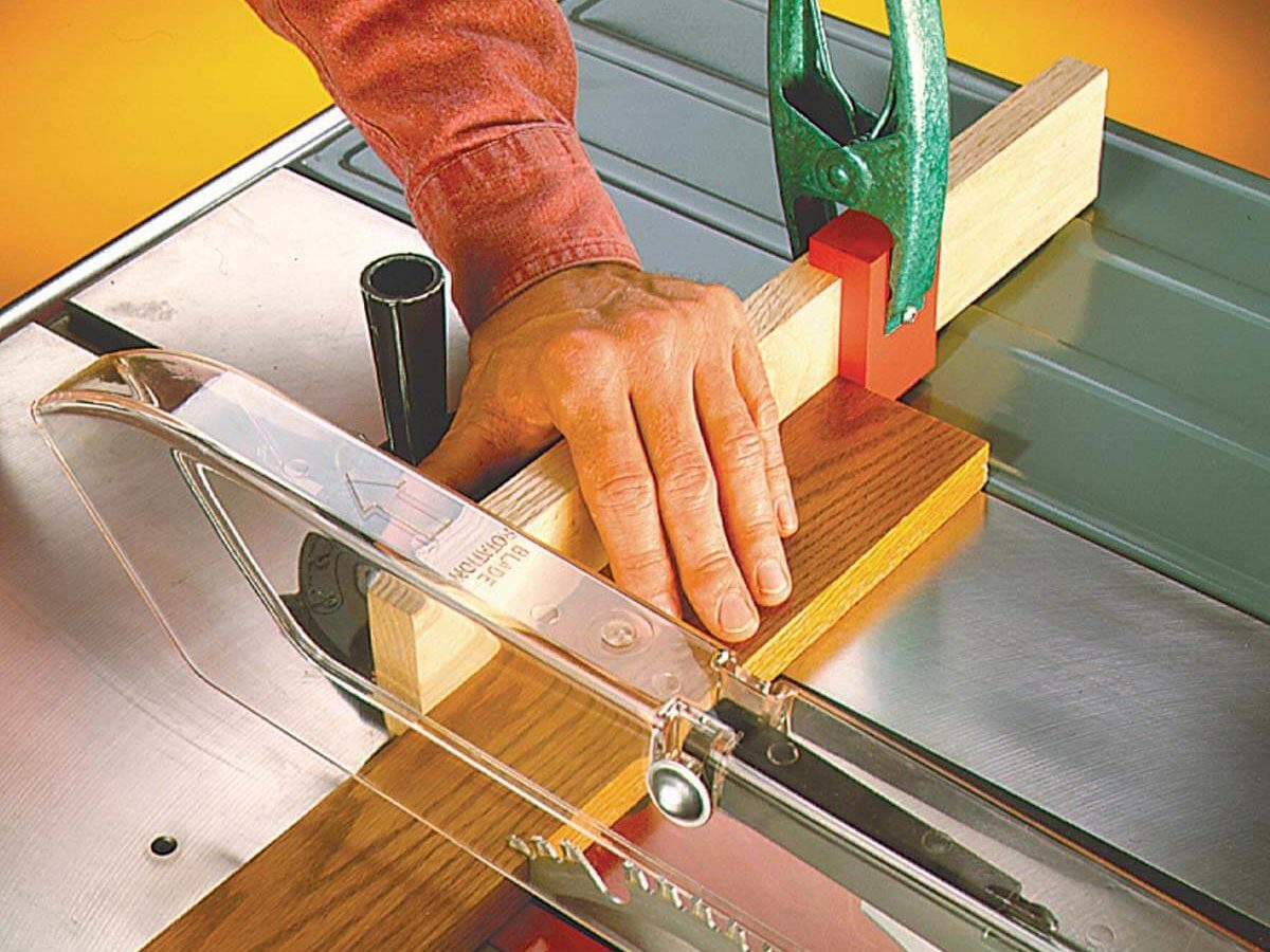 Here’s a stop block that’ll work great on every fence in your shop. Make an L-shaped block (the red piece in the photo) to ride upside down on the fence on your miter gauge. To make the L-block, cut a short 1-1/2 in. wide strip of 1/2-in. thick board, then cut a 1/2-in. piece off the end and glue it at a right angle to the end of the longer one. Screw the L-block to a strong spring clamp by drilling a screw hole in the tip of one clamp jaw, then screw the block inside the clamp with a fairly loose fit. When you snap the block in place on the fence, it’ll snug up tight to both edges. Put adhesive-backed sandpaper on the fence side of the L-block to make it grip extra tight.