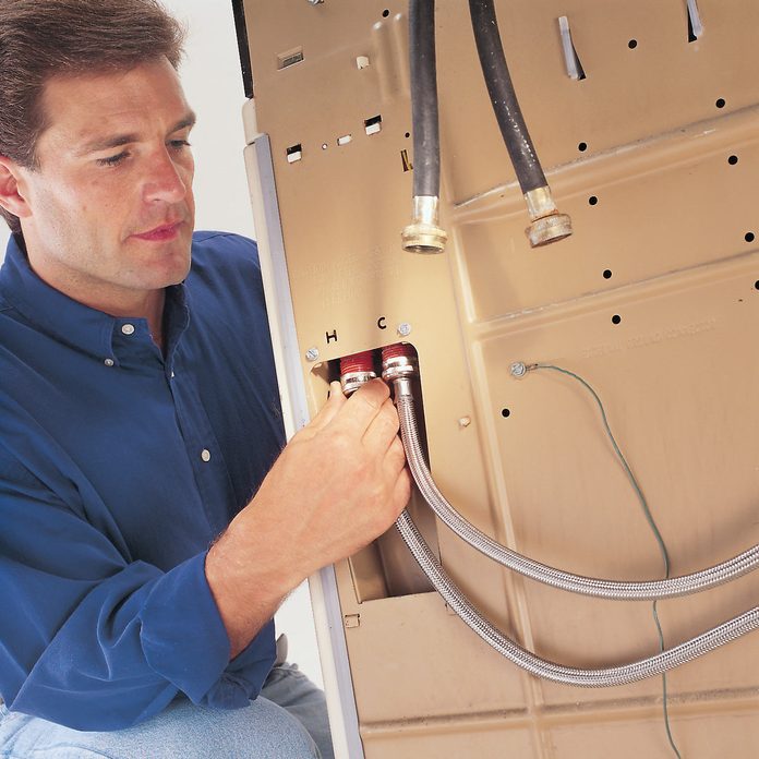 It’s a good idea to replace them with no-burst washing machine water hoses which are encased in a woven metal sleeve that prevents weak spots in the rubber from developing into leaks.