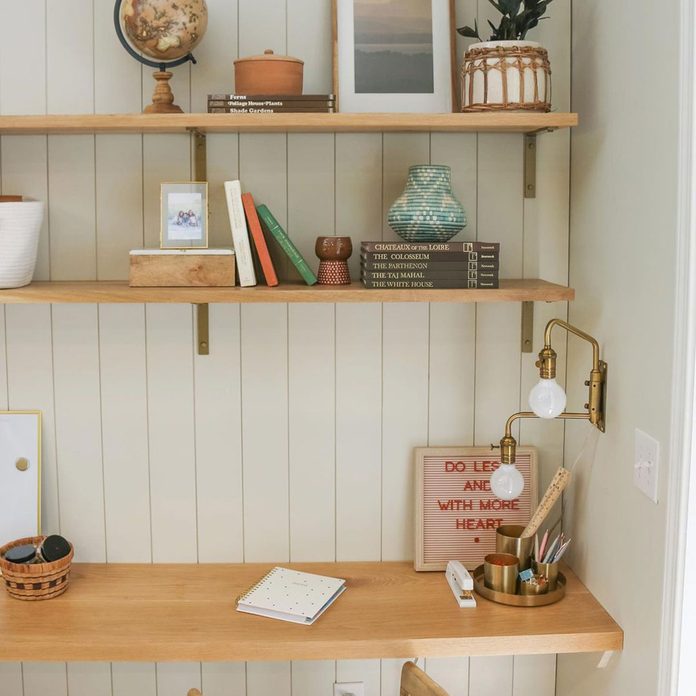 The right decor choices can make a small space feel bigger, like in this small office from @prettyrealblog. Vertical shiplap draws the eye up, and the neutral color palette feels calm and airy. The wall-mount shelves and smart sconce lighting free up desk space.