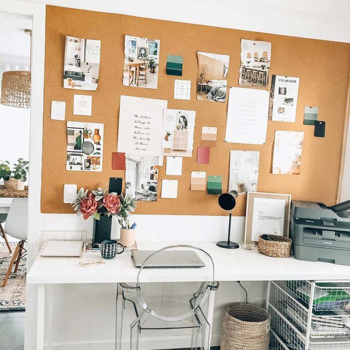 How can one wall host so much? Pin the praise on @oakeydesignandco‘s large cork board, equal parts inspiration and organization. (Use cork tiles to customize one to your space.) It definitely communicates “command central” while helping keep the desktop clear — especially challenging in a small space. And an acrylic chair is always a strong choice in a small space, since it all but disappears.