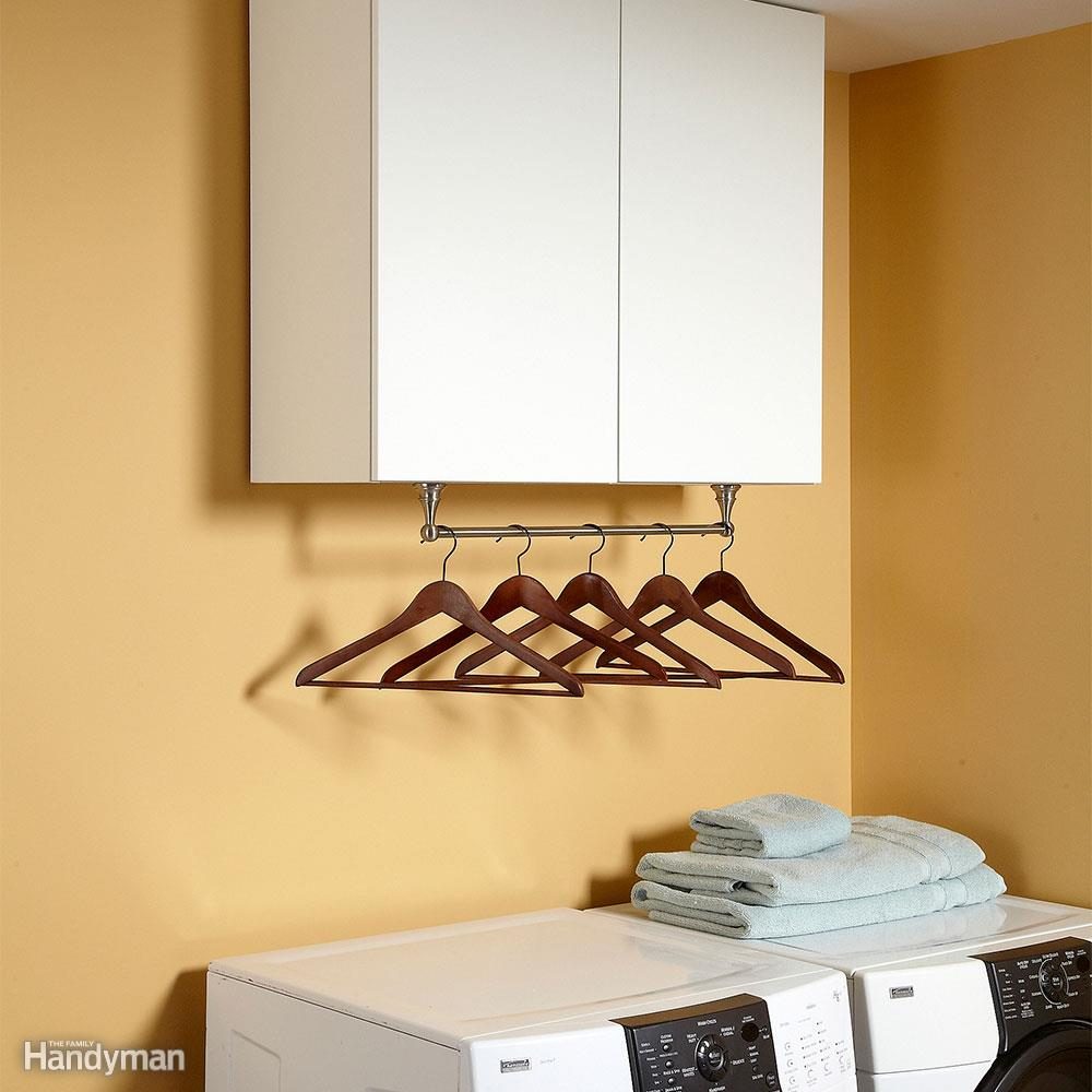 If you have shelves or cabinets above your washer or dryer, you’ve got the perfect spot to store clothes hangers. Just mount a towel bar to the bottom of the cabinets. This puts hangers at your fingertips so you can hang up shirts and slacks fresh from the dryer.