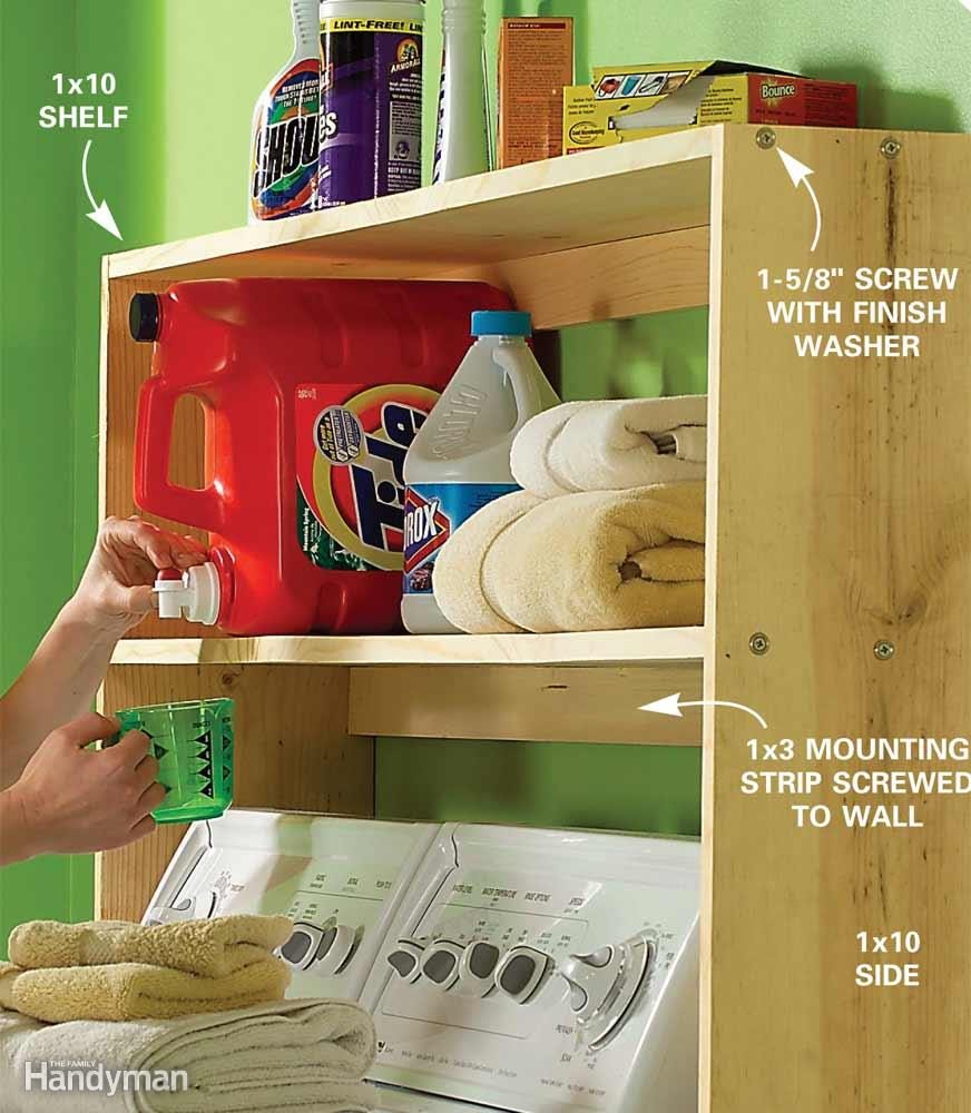 Clean up the clutter of detergent boxes, bleach bottles and other laundry room stuff. Install a shelf that fits just above the washer and dryer. Screw ordinary shelf brackets to the wall and mount a board that just clears the tops.