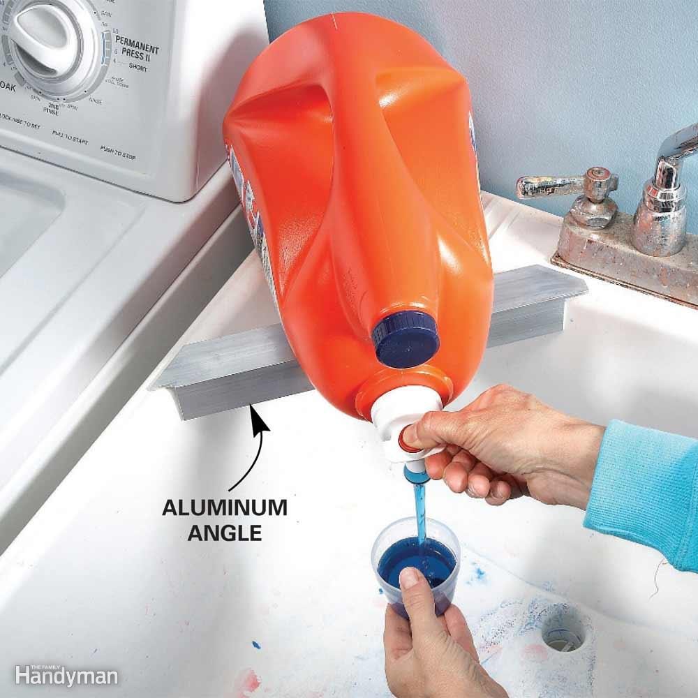 Dripless liquid detergent containers always drip just a little. Keep it under control with a special shelf on the corner of the laundry tub. Just cut a 1-1/2-in. aluminum angle long enough to support the front edge of the container, then glue it to the tub with silicone caulk. Rest the container on the ledge and drips will just fall into the laundry tub instead of creating a gooey mess somewhere else.