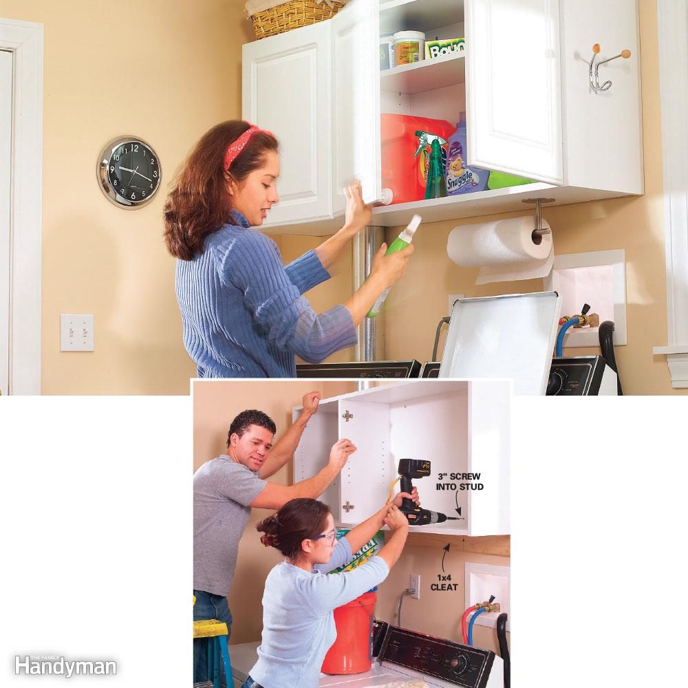 Turn that wall space above the washer and dryer into a valuable dust-free storage space by adding a utility wall cabinet. Chances are, a dryer vent or some other obstruction exists right where the new cabinet goes. To solve this problem, simply cut away the back and insert a 4-in. galvanized duct as a liner to give the cabinet a 1-in. clearance from the dryer vent, preventing heat from building up inside the cabinet. With the liner in place, the vent is isolated behind the cabinet, keeping everything inside cool and clean.