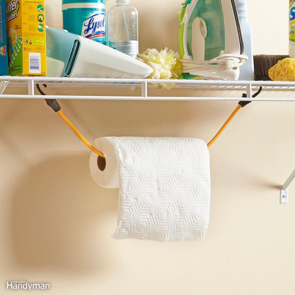 If the roll of paper towels on the shelf in your laundry or utility room keeps falling off, try this: Slip a bungee cord through the roll and hang it from the wire shelving. And here are some tips for hanging a more permanent solution.