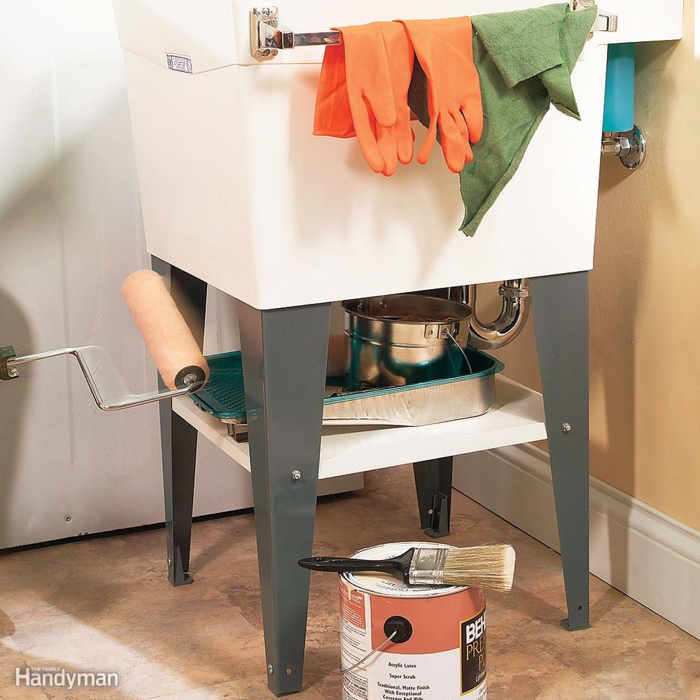 Tired of moving all that stuff under the sink every time you mop the floor? Just buy a melamine closet shelf from a home center and a length of suspended-ceiling wall angle (sorry, it only comes in 10-ft. lengths, but it’s cheap and you can have it cut for transport). Also pick up four 1/2-in. No. 8-24 bolts, washers and nuts. Attach it to the underside of your laundry room utility sink for a handy place to store old painting supplies and create some small room organization.