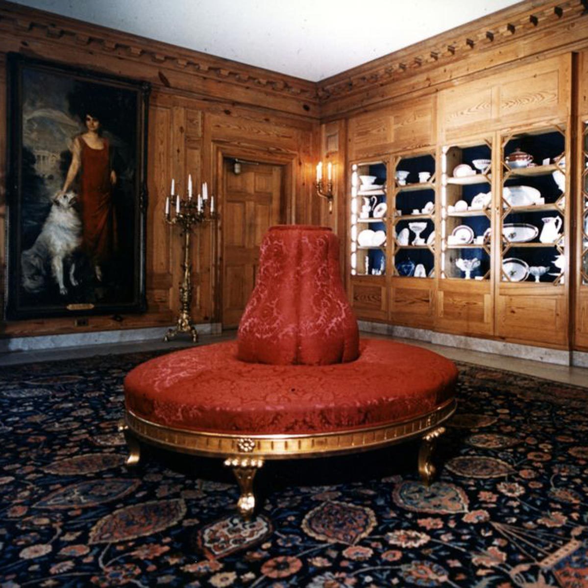 Boudin had the China Room’s paneling glazed in three shades of gray. Corner brackets in the display cabinet doors were removed and the interior was lined with red cotton velvet. The floor was carpeted with a snowflake pattern and gray velvet drapes, trimmed with red and white silk fringe were hung.