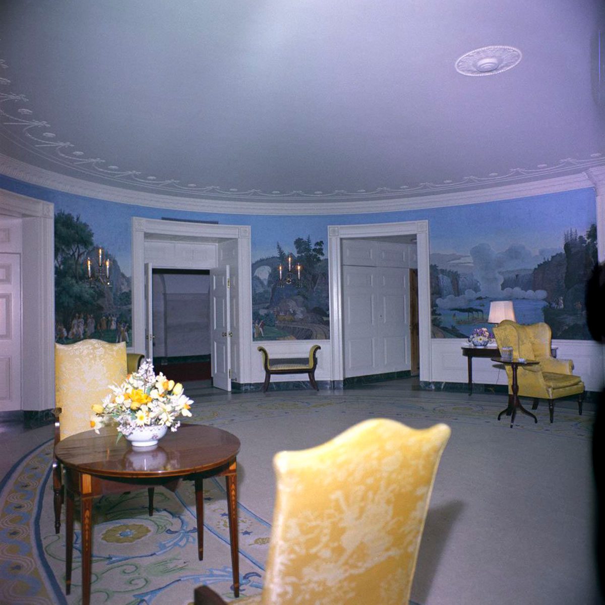 While the Kennedys were in the White House it was used as a drawing room. Jackie had it painting a soft yellow and brought in a pale yellow oval carpet. Oriental rugs topped the carpet. Sister Parish designed the room initially and then Boudin added some touches to it. Boudin replaced the furniture with French antiques from the 18th and 19th centuries in the Louis XVI style. Two green marble columns were made to hold antique, electrified candelabras.
