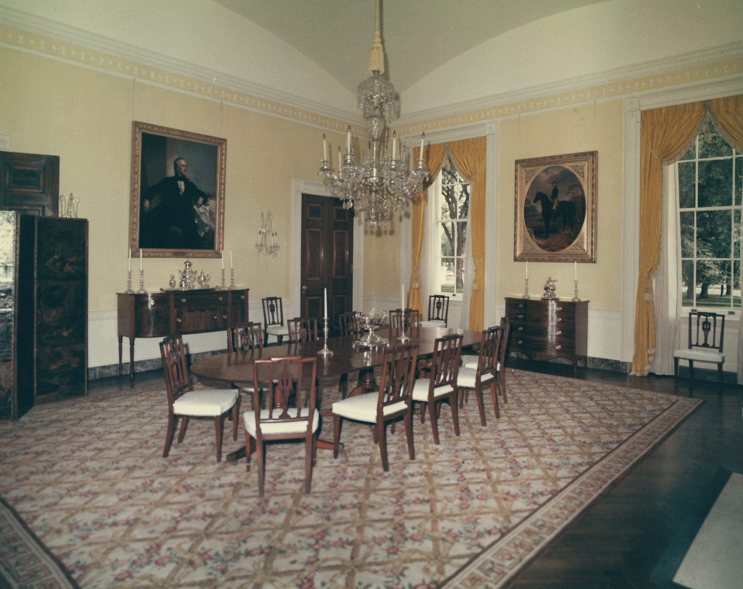 Federal-style antiques furnished the room and the family sat at a Sheraton pedestal dining table. They ate with silverware purchased by Andrew Jackson in 1833.