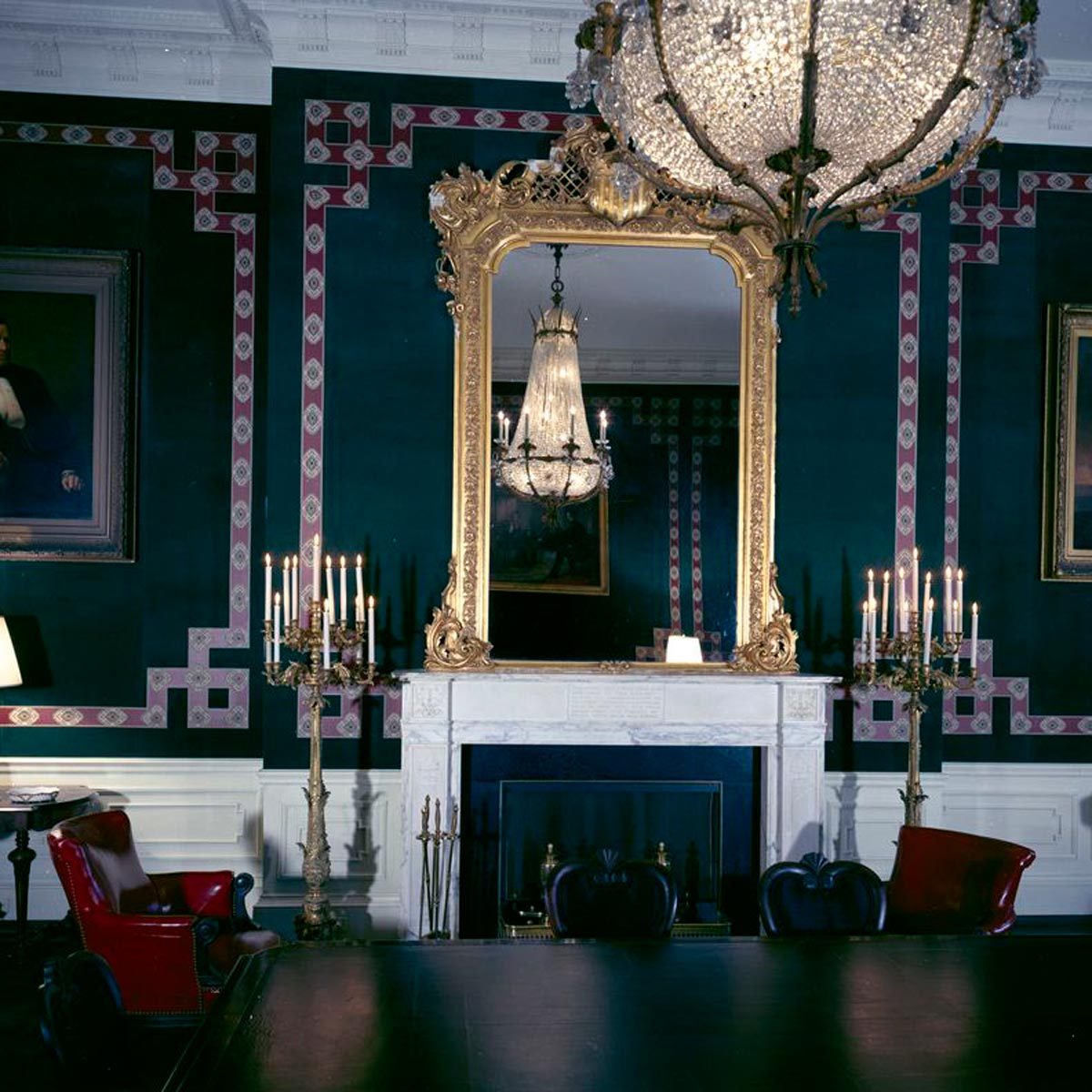 Kennedy decorated the Treaty Room (formerly known as the Monroe Room) to represent Victorian era history. The room included dark green, burgundy and gold. Kennedy and the committee reintroduced a table and chairs that belonged to President Grant and brought in an electrified gas chandelier that used to stand in the East Room. A large, gilded Rococo Revival mirror over the mantel that once hung in the Green Room was brought to the Treaty Room. The room had drapery based on a design during Lincoln’s era.
